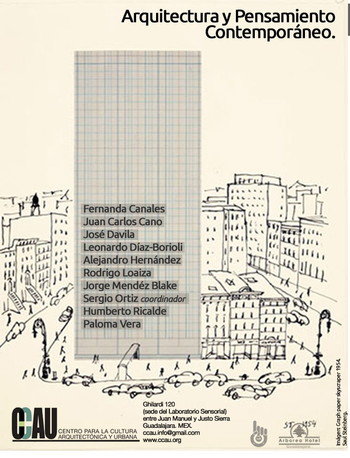 De igual modo, agrega Peña, “había interés por parte del CCAU para manejar estas cuestiones más a fondo y, en lugar de invitar sólo a una persona (especialista local o a nivel nacional), tratamos de hacerlo mucho más interesante y confrontar ideas que se manejan aquí en la ciudad con arquitectos y artistas de la Ciudad de México, de donde vendrán algunos profesionales –además de los de Guadalajara–, esto es, gente que está hablando actualmente de teoría e historia arquitectónica, que escriben, hoy por hoy, en revistas nacionales o internacionales”.